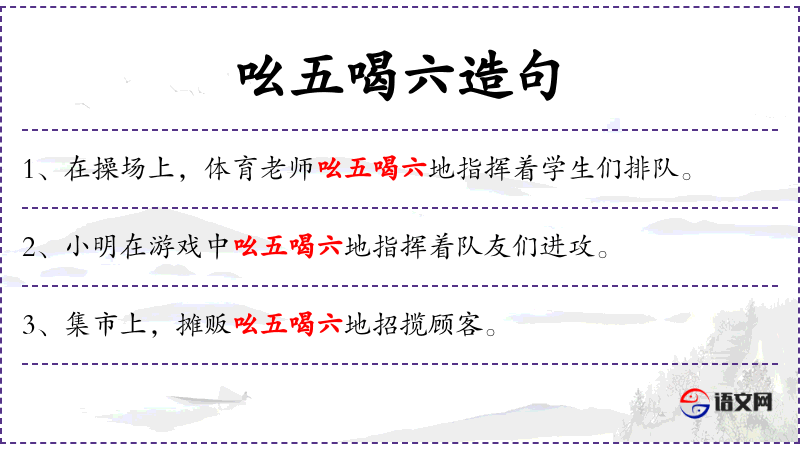 - 吆五喝六:形容大声呼喊,通常带有命令或催促的意味。