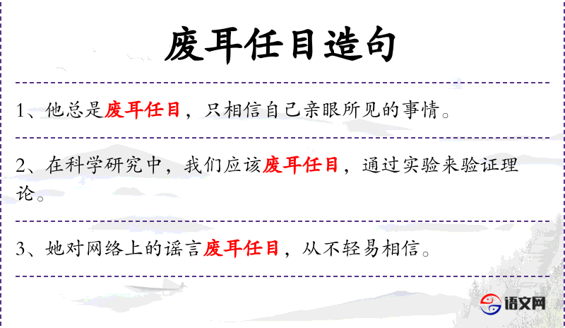 4. 【废耳任目】 废:放弃;任:信任。放弃了耳朵,信任眼睛。指不相信别人的意见,只凭信自己眼见的现象。