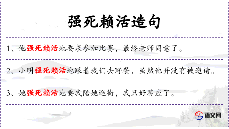 - 强死赖活地:副词短语,形容坚持不懈、不顾一切的样子。