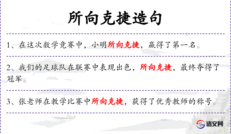 - 状语:在这次英语演讲比赛中所向克捷