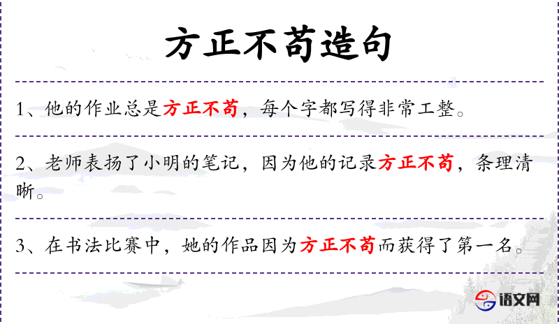 句子:“在书法比赛中,她的作品因为方正不苟而获得了第一名。”