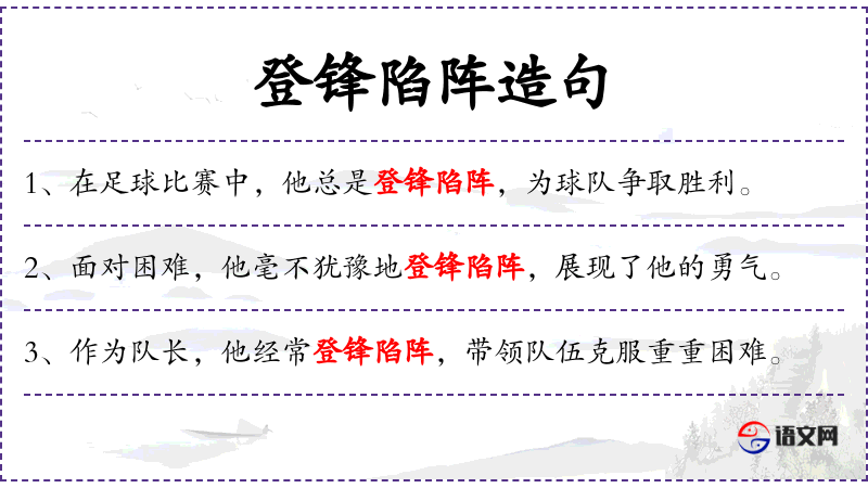 2. 【登锋陷阵】 - 冲锋陷阵。形容作战英勇。