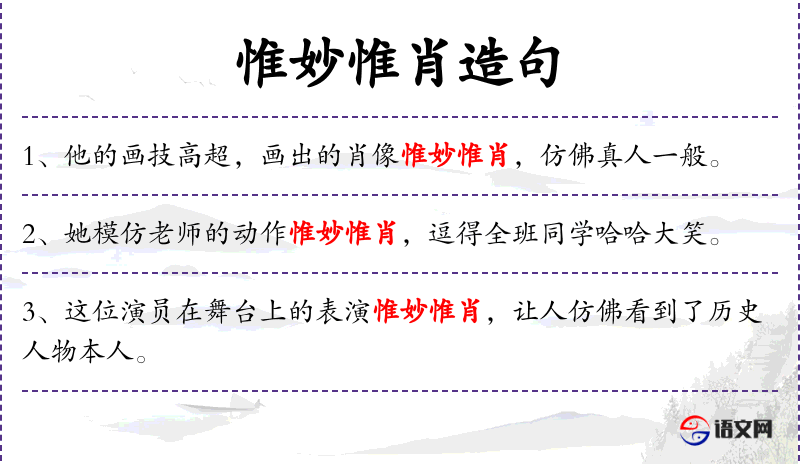 - 惟妙惟肖:形容描绘或模仿得非常逼真,同义词有“栩栩如生”、“活灵活现”。
