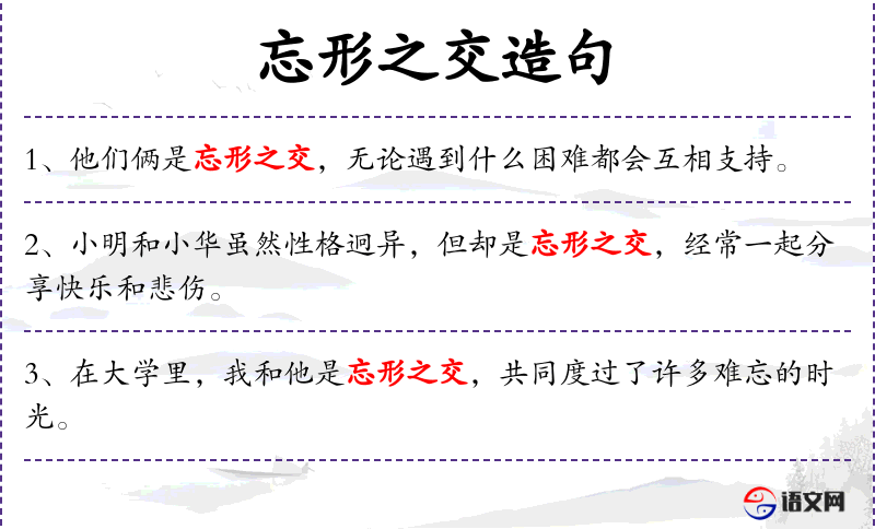 - 忘形之交:形容朋友之间关系非常亲密,以至于忘记了彼此的缺点。