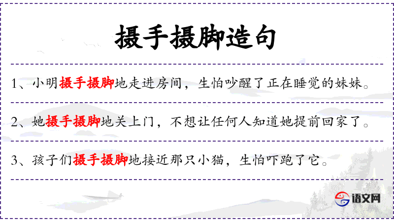 - 摄手摄脚地:副词,形容动作轻柔、小心翼翼的样子。