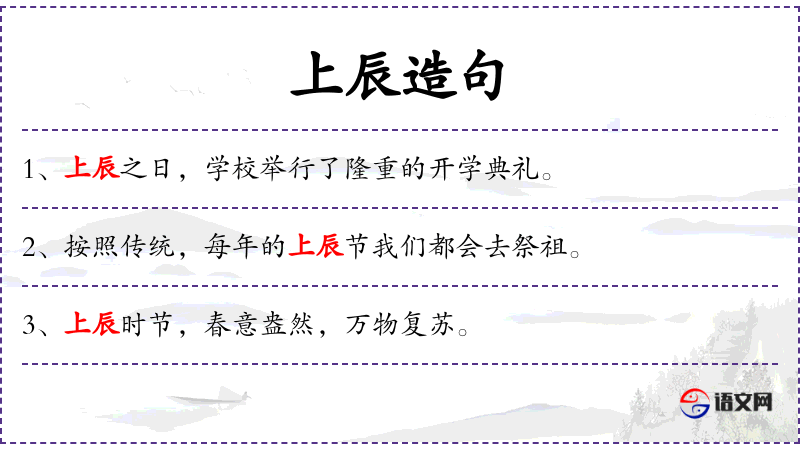 2. 【上辰】 - 上好的日子,良辰; 农历每月上旬的辰日。