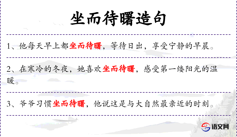 - 坐而待曙:表示坐着等待黎明的到来,待曙是等待天亮的文雅表达。