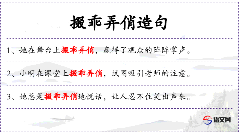 - 掇乖弄俏:成语,意思是故意做出一些可爱或引人注意的行为。