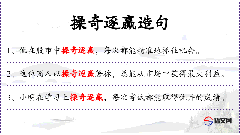 - 操奇逐赢:这个词组可能是一个成语或特定表达,意指运用巧妙或独特的策略来取得胜利。