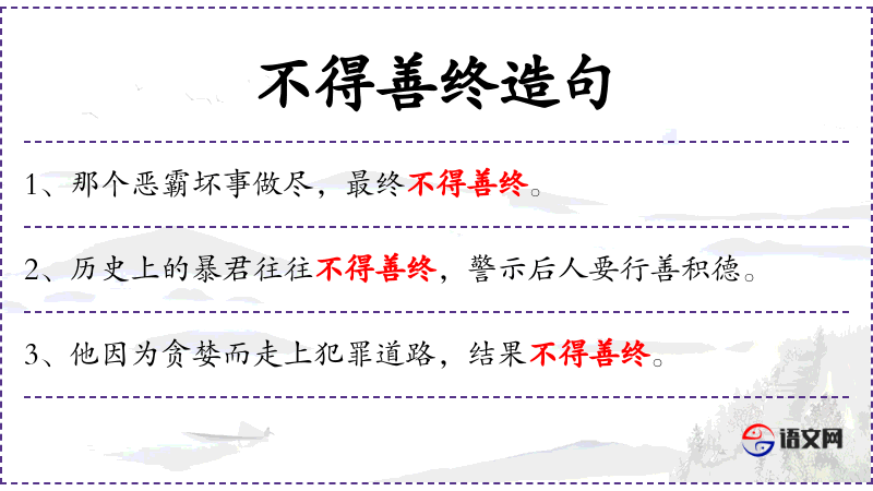 1. 【不得善终】 - 善终:正常死亡。指人不得好死。常指恶人应有的坏下场。