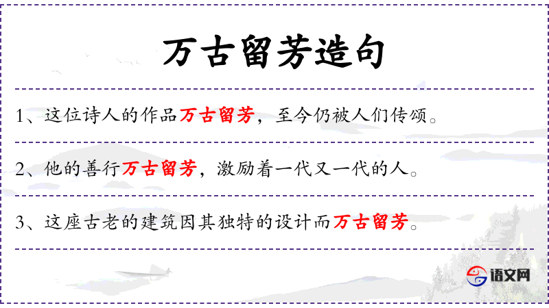- 万古留芳:意为永远流传,不朽。常用于形容文学作品或人物的伟大和不朽。