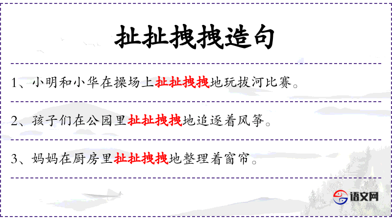 - 状语:在森林里、扯扯拽拽地