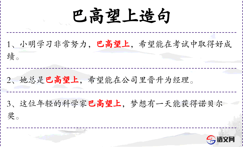 - 巴高望上:这个成语体现了**文化中对个人追求卓越和不断进取的价值观。
