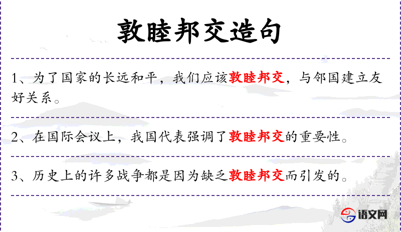 1. 【敦睦邦交】 敦:纯厚,诚恳;睦:和睦。保全国家之间的关系诚挚友好。