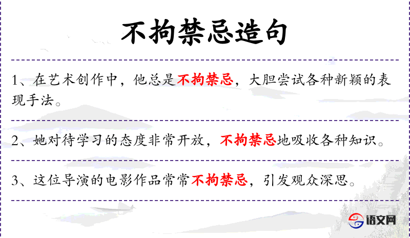 句子:“在艺术创作中,他总是不拘禁忌,大胆尝试各种新颖的表现手法。”