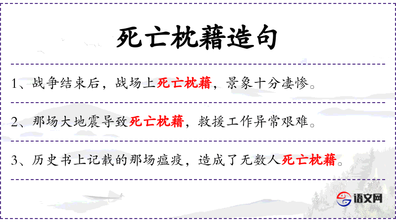 7. 【死亡枕藉】 枕藉:纵横相枕而卧。形容死的很多。
