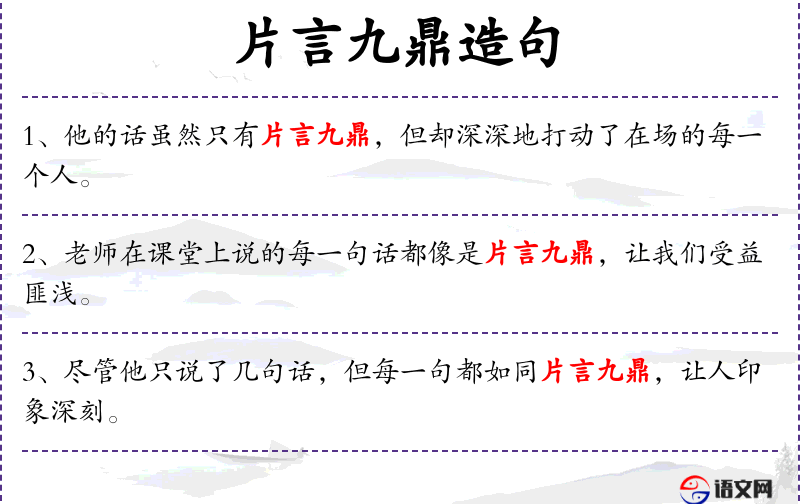 2. 【片言九鼎】 - 九鼎:古代国家的宝器,象征九州。比喻说话力量大,能起很大作用或指人说话十分守信。