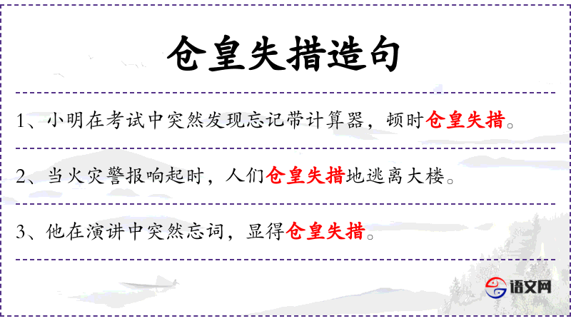- 状语:考试时间快结束时、顿时、仓皇失措