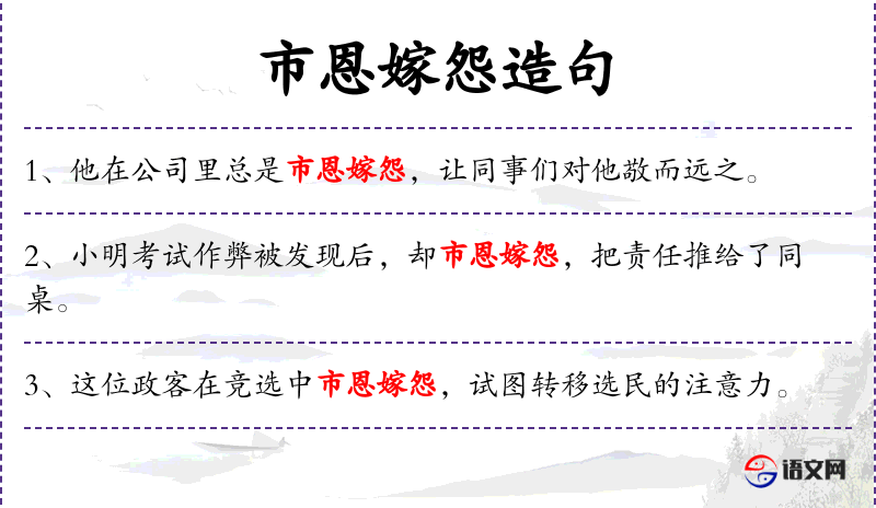- 市恩嫁怨:成语,意思是把别人的恩惠当作自己的,把责任推给别人。