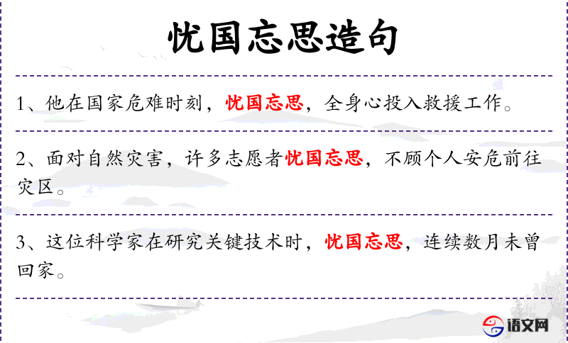 - 忧国忘思:形容对国家的忧虑超过了个人思虑,与“worried about the nation and forget personal concerns”相对应。
