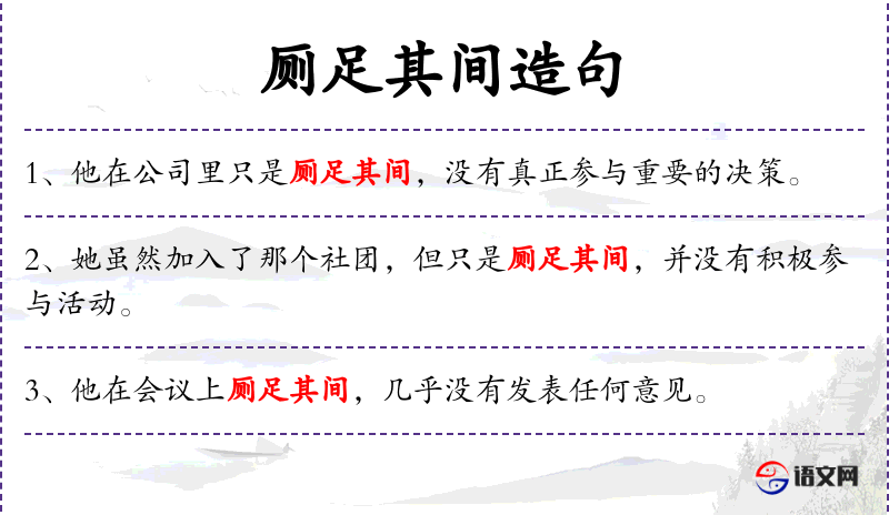 - 厕足其间:这个词组意为“只是稍微参与一下”,含有轻微的贬义,表示参与程度不深。