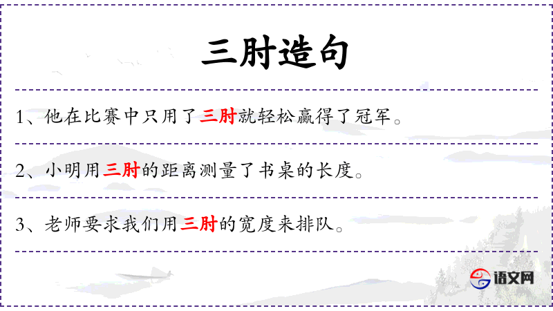 1. 【三肘】 - 肘,度量词。一肘一尺五寸,三肘为四尺五寸『班固《白虎通.圣人》"汤臂三肘,是谓柳翼,攘去不义,万民蕃息。"一说一肘二尺,则三肘为六尺。