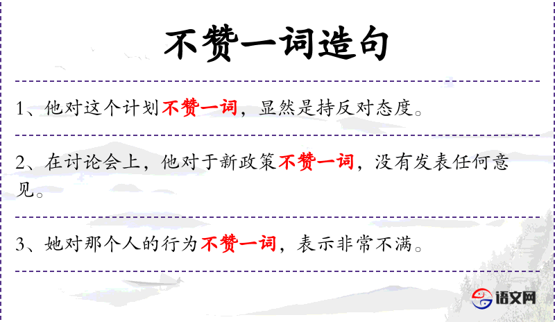 - 不赞一词:成语,意思是完全不表示赞同,保持沉默。