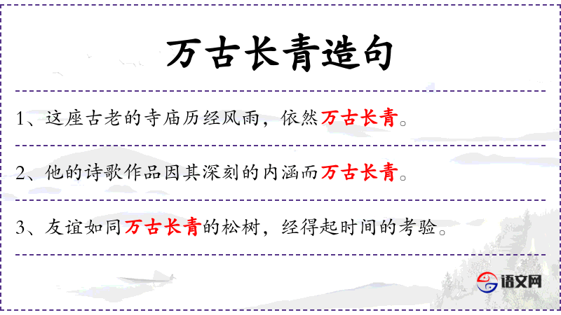 句子中“万古长青”是一个典型的汉语成语,用来形容事物具有长久的生命力和价值。这与中华文化中对历史和传统的尊重有关。