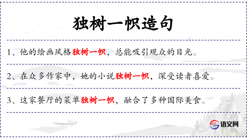 3. 【独树一帜】 - 树:立;帜:旗帜。单独树起一面旗帜。比喻独特新奇,自成一家。