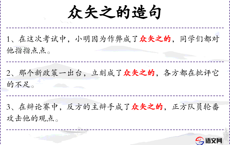 - 众矢之的:这个成语源自古代射箭,比喻成为大家攻击的目标,反映了**文化中对集体和谐的重视。