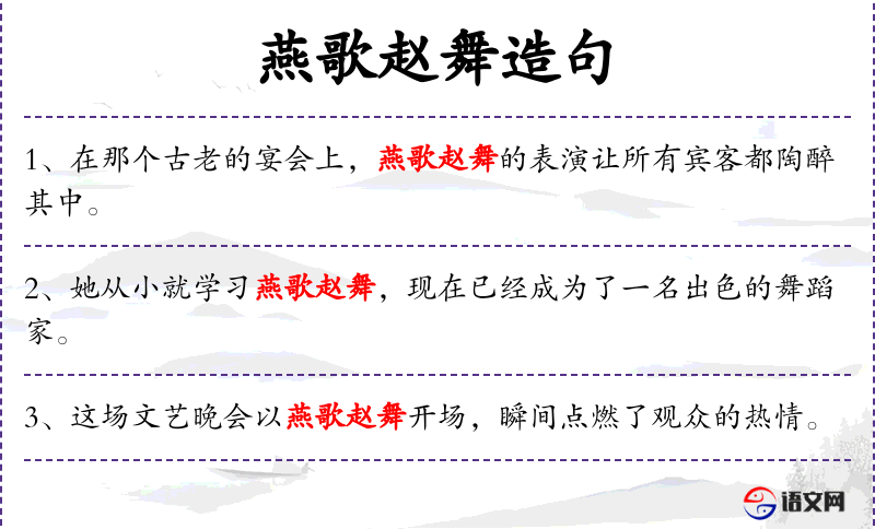 2. 【燕歌赵舞】 - ①古燕赵人善歌舞,泛指美妙的歌舞。②用以形容文辞美妙。