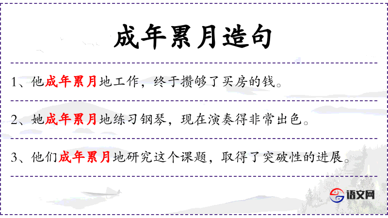 1. 【成年累月】 成:整;累:积聚。一年又一年,一月又一月。形容时间长久。