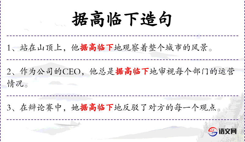 句子中“据高临下”可能蕴含着一种优越感或掌控感,这在文化中有时与权力和地位相关。了解相关的成语如“高瞻远瞩”可以加深对句子文化意义的理解。