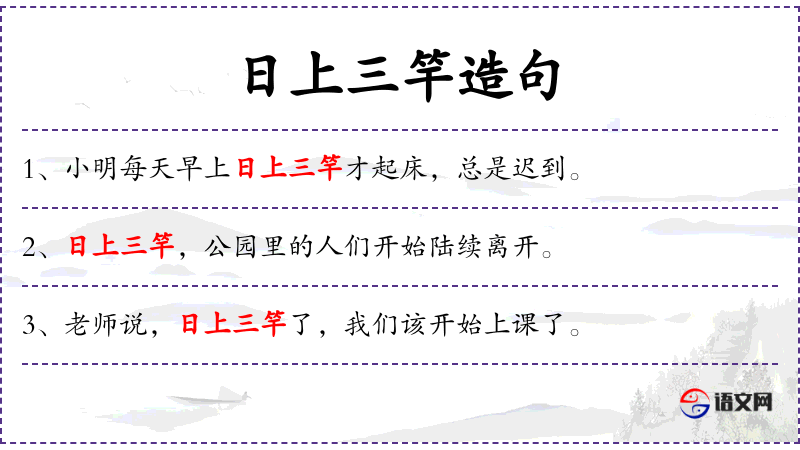 - 日上三竿:这是一个成语,意思是太阳升得很高,通常用来形容时间已经不早了。