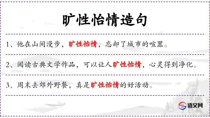 - 宾语:“旷性怡情,忘却烦恼”