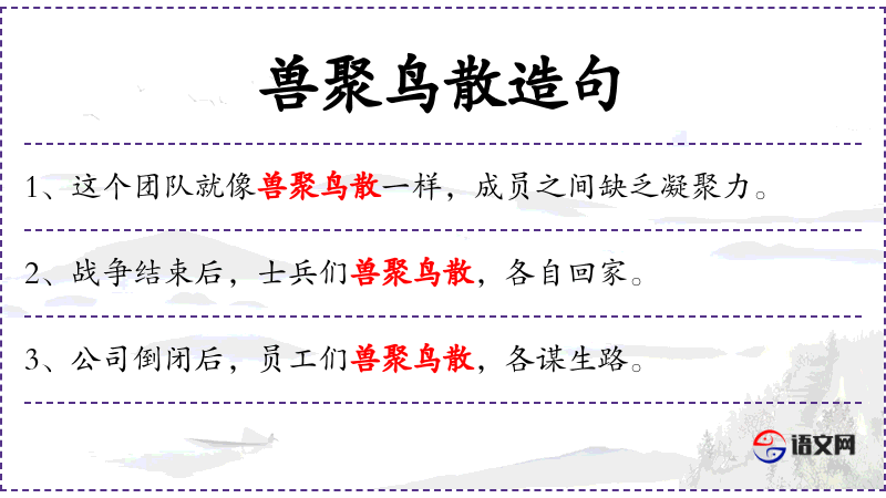 - 文化意义:“兽聚鸟散”是一个比喻,形象地描述了人群的聚集和分散。