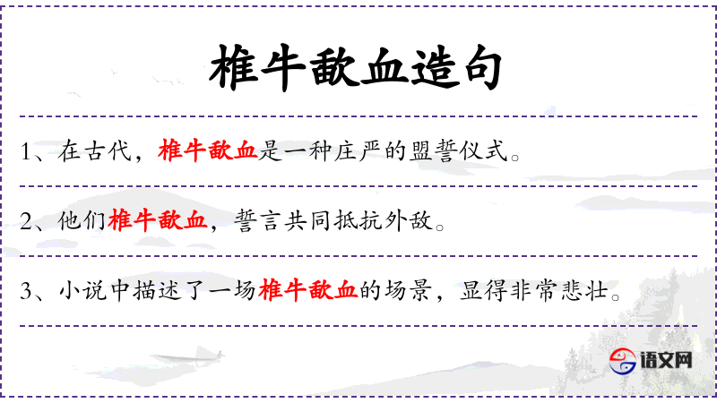 古时聚众盟誓,杀牛取其血含于口中或以血涂嘴唇,表示诚意。