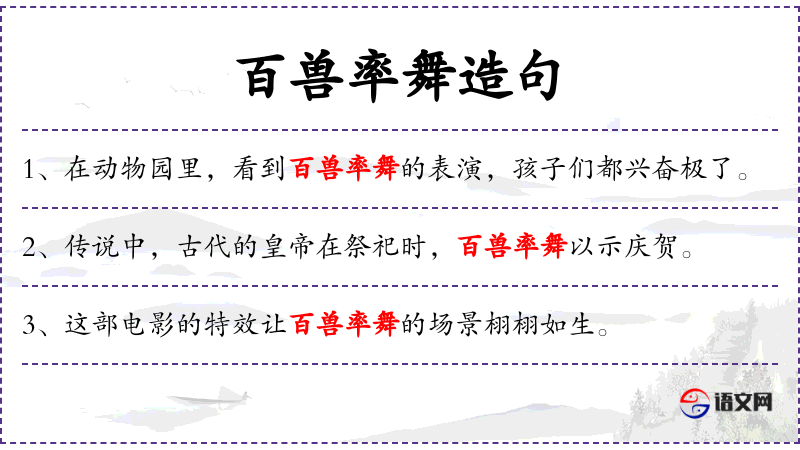 5. 【百兽率舞】 - 各种野兽,相率起舞。旧指帝王修德,时代清平。