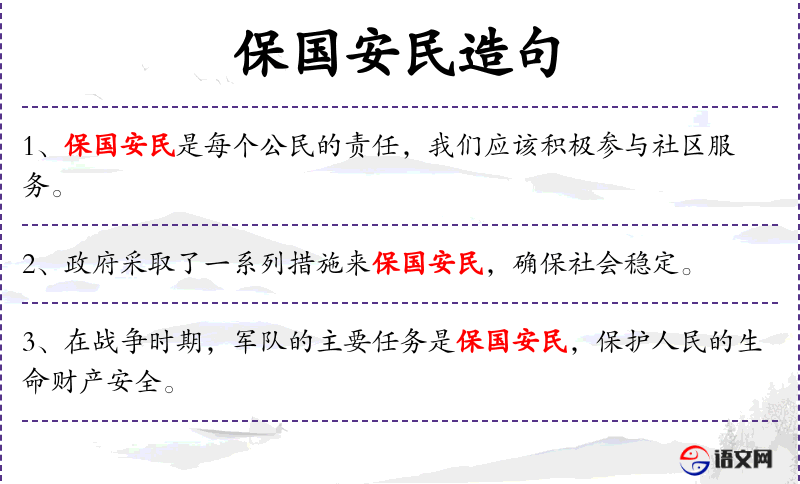 - 保国安民:保护国家安全,维护民众福祉。
