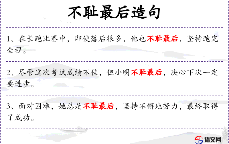 1. 【不耻最后】 因为跑到最后而感到可耻。比喻凡是只要坚持到底,就能达到目的。