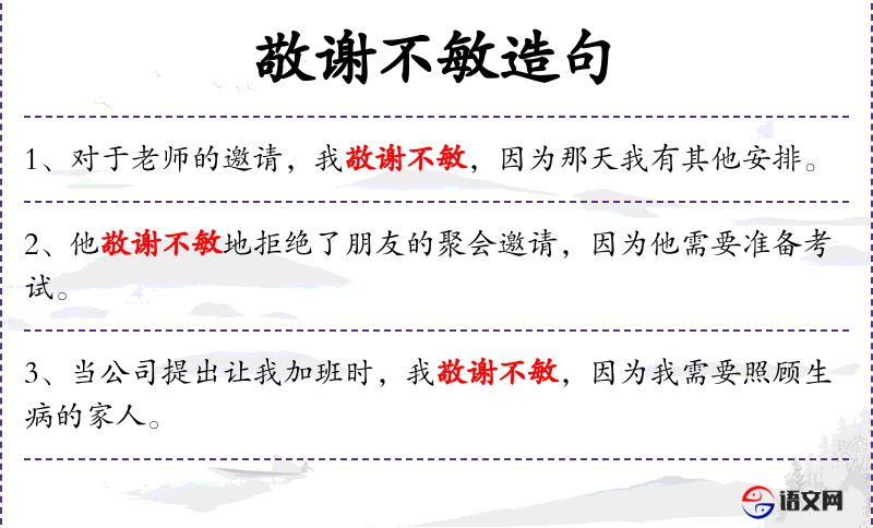 - 成语:“敬谢不敏”是**文化中常见的成语,用于礼貌地拒绝他人的请求。