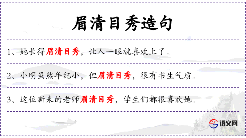 1. 【眉清目秀】 - 眉、目:眉毛和眼睛,泛指容貌。形容人容貌清秀不俗气。