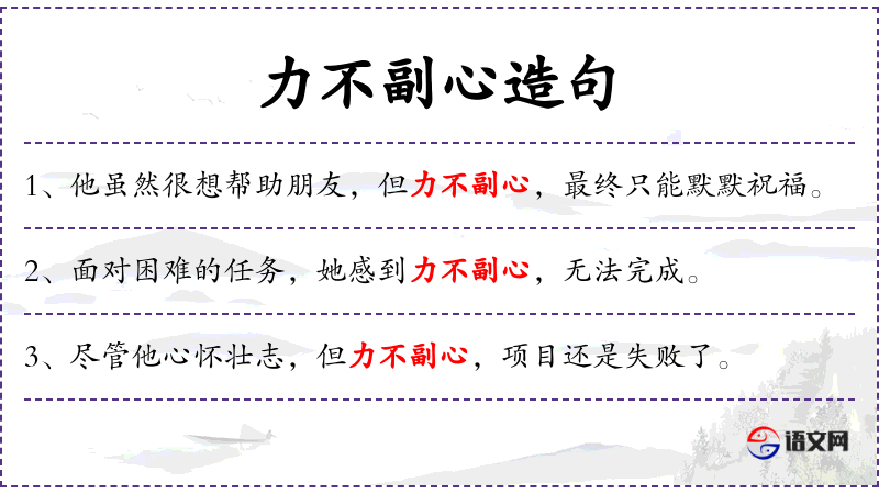 - 力不副心:这个成语在**文化中常用来形容一个人的实际能力与他的愿望或期望不符。