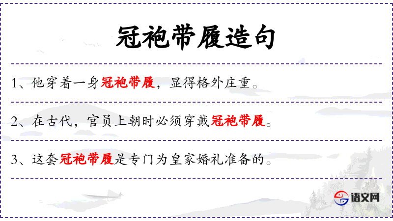 - 冠袍带履:指古代官员的服饰,包括帽子(冠)、上衣(袍)、腰带(带)和鞋子(履)。