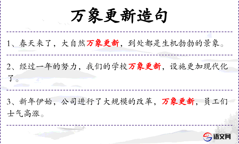 “万象更新”是一个富有**文化特色的成语,常用于形容事物全面更新或焕然一新。这个成语的使用体现了汉语表达的丰富性和文化内涵。