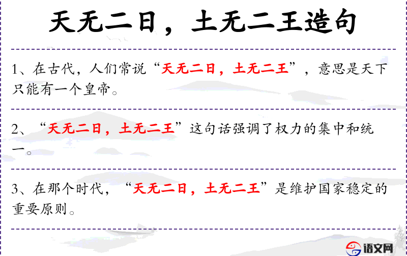 - “学生们通过对‘天无二日,土无二王’的学*,掌握了古代政治结构的核心特点。”