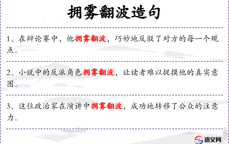 - 拥雾翻波:这个成语形容手法高明,能够巧妙地操控局势或舆论。