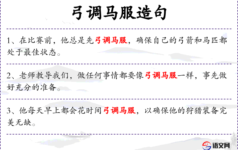 - 弓调马服:原指古代射箭前调整弓弦和马匹装备的行为,比喻做好准备工作。