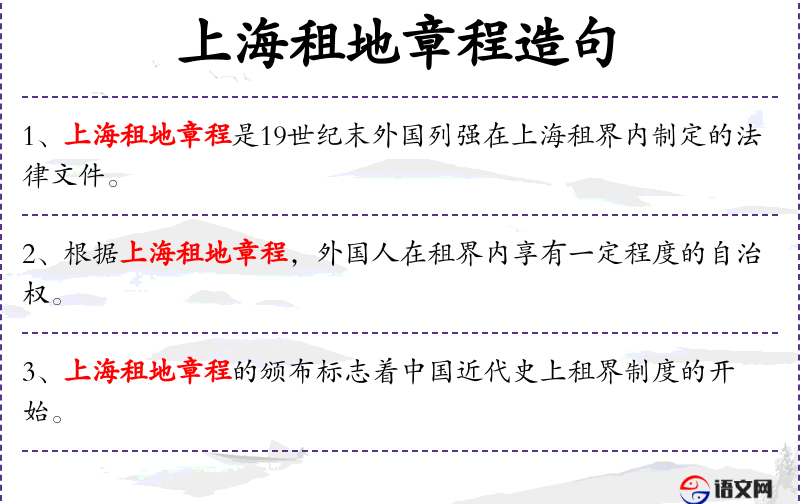 2. 【上海租地章程】 又称《上海地皮章程》。1845年英国驻上海领事巴富尔胁迫清苏松太道宫慕久签订。共二十三款。划定洋泾浜(今延安东路)以北、李家庄(今北京东路)以南地区作为英国人租借居留的地段,后称英租界”,是资本主义国家在中国强占的第一个租界。