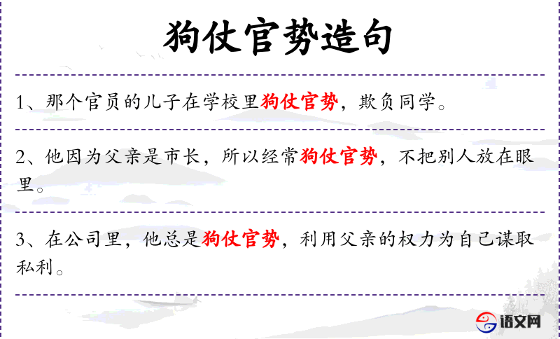 1. 【狗仗官势】 - 仗:倚仗、仗势。比喻倚仗官府势力欺压人。